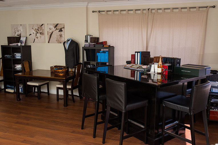 Originally, Bespoke & Co. operated out of a small tailor shop in Tampa, FL. In September 2011, we searched for a brick and mortar facility more conducive to our needs and the needs of our clients. We relocated to South Tampa and renovated the space that we currently occupy at 3305 W. Bay to Bay Boulevard. Just a short drive from downtown Tampa, Bay to Bay has become one of the most active thoroughfares in South Tampa. We strived to create a more welcoming, lounge like environment where our clients feel comfortable hanging out, attending events or just stopping by to say hello. Our 1200 sq. ft. space is complete with a full kitchen and bar. We have a large screen television which is usually tuned to ESPN or the Golf Channel and we offer wifi for our tech obsessed clients. While we operate by appointment, clients and friends typically stop by for the chance to run into their favorite local professional athlete or media personality.